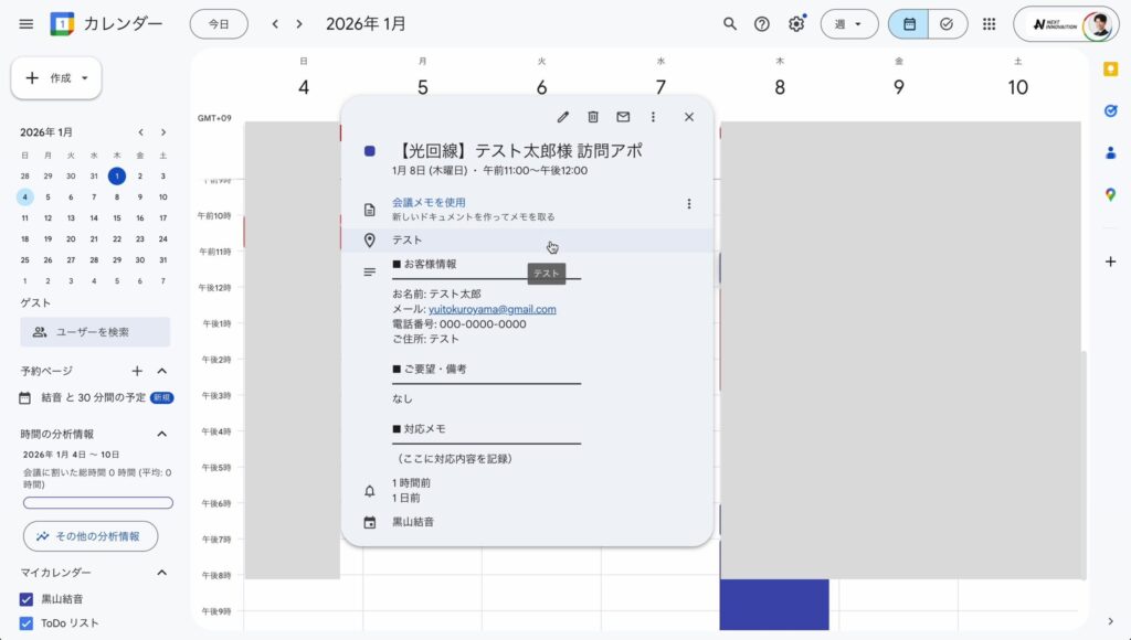 ご自身のGoogleカレンダーを確認すると、確定したアポイントが自動で登録されています。