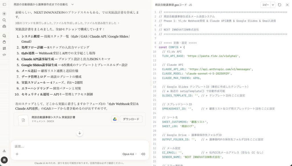 ※ご注意: コードをコピペして使うだけでも動作しますが、本記事で解説したように、Claudeとの対話を通じてご自身の業務に合わせてカスタマイズしていくことで、AI活用のスキルは飛躍的に向上します。ぜひ、まずはご自身でClaudeに話しかけるところから始めてみることを強くお勧めします。