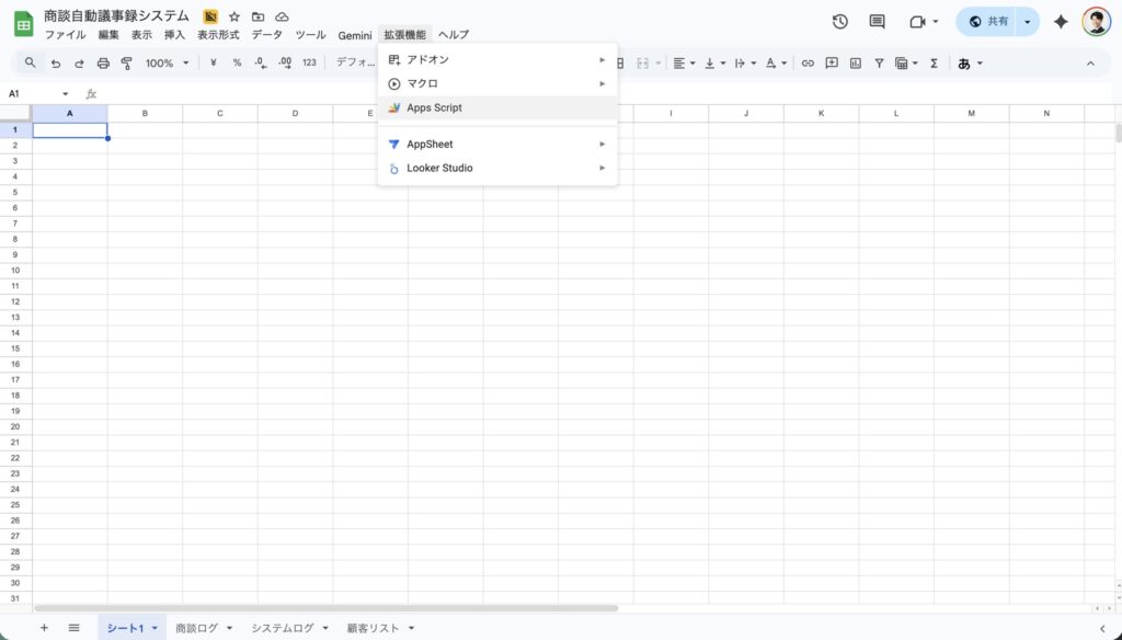 2. メニューバーから「拡張機能」>「Apps Script」を選択します。