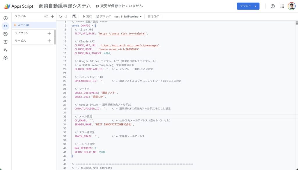 (スクリーンショット:スプレッドシートIDやフォルダIDをコードに設定している様子)