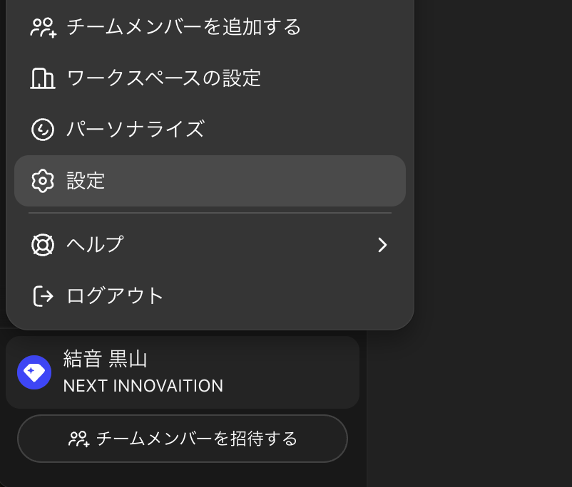 まず、ChatGPTの画面左下にあるあなたのアカウント名をクリックし、表示されるメニューから「設定(Settings)」を選択します。