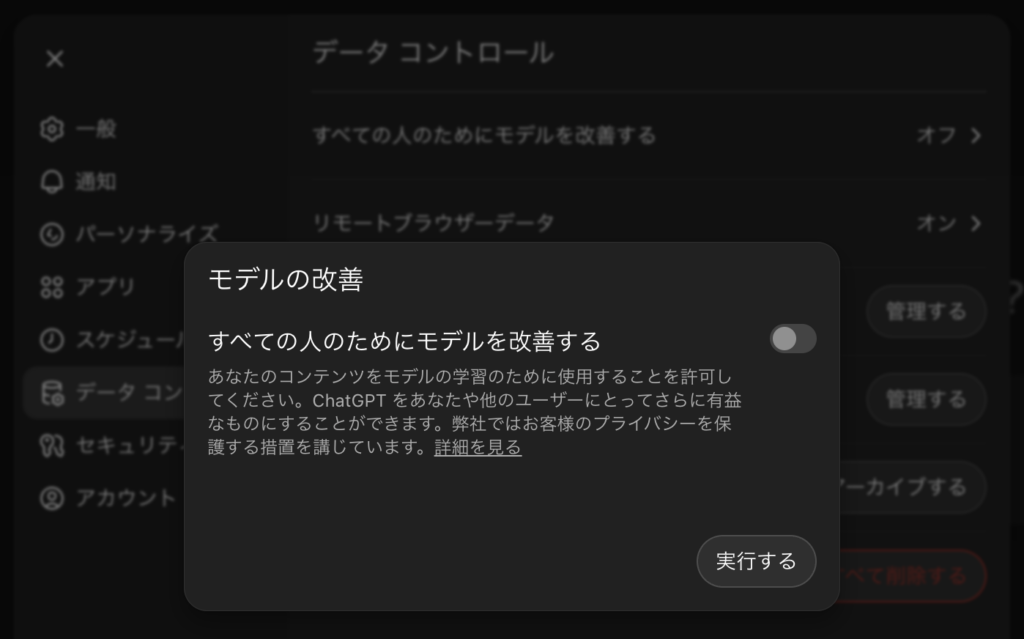 初期設定ではこの項目がオンになっているため、あなたの会話データがモデルの学習に使用されてしまいます。必ずオフにしておきましょう。