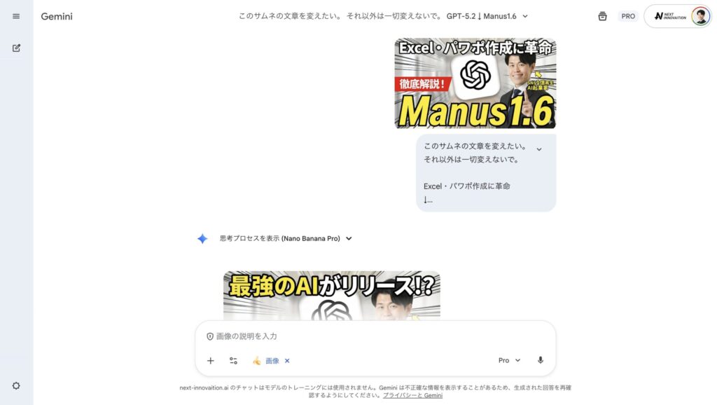 | 画像生成 | Nano Banana Pro | 日本語の指示にも強く、高品質な画像を生成。 |