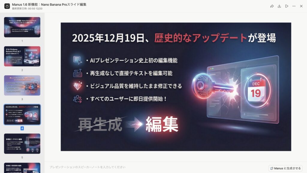 Manusは、単に質問に答えるだけでなく、ユーザーの代わりに実際にタスクを実行してくれる「AIエージェント」です。資料作成やマニュアル作成、さらには簡易的なアプリ開発まで、複雑なワークフローを自動で実行します。