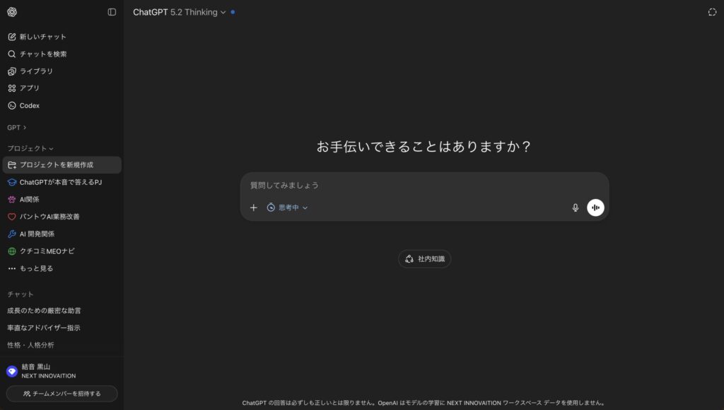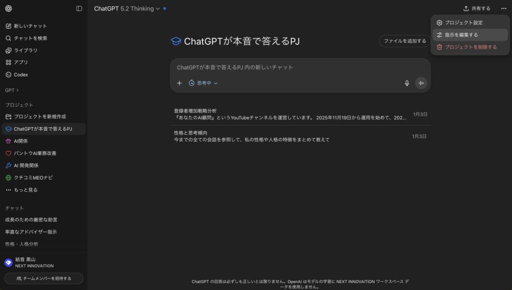 この設定を行うと、どのプロジェクト、どのチャットで会話を始めても、ChatGPTは常にあなたに対して本音で向き合う「辛口アドバイザー」として機能します。