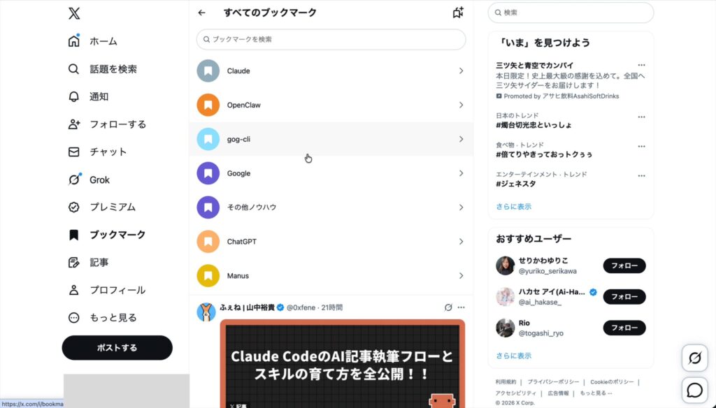 ▲ 「Claude」「OpenClaw」「gog-cli」「Google」「その他ノウハウ」「ChatGPT」「Manus」など、ツールや分野ごとにフォルダ分けされたブックマーク画面。左サイドバーの「ブックマーク」メニューから一覧にアクセスできる。