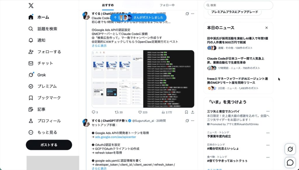 ▲ AI関連の投稿のみが並ぶように最適化されたXのタイムライン。右側の「本日のニュース」にもAI関連のトピックが表示されている。