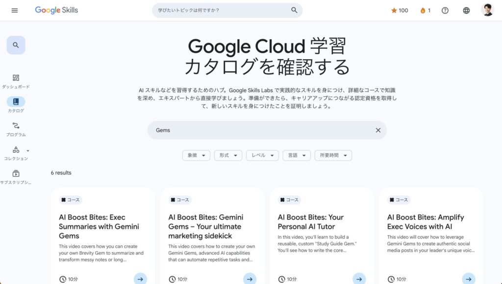 「Gems」は、特定のタスクに合わせてGeminiをカスタマイズする機能です。毎回同じような指示を出す手間を省き、再現性の高いアウトプットを得ることができます。検索窓に「Gems」と入力して、関連講座を探してみましょう。