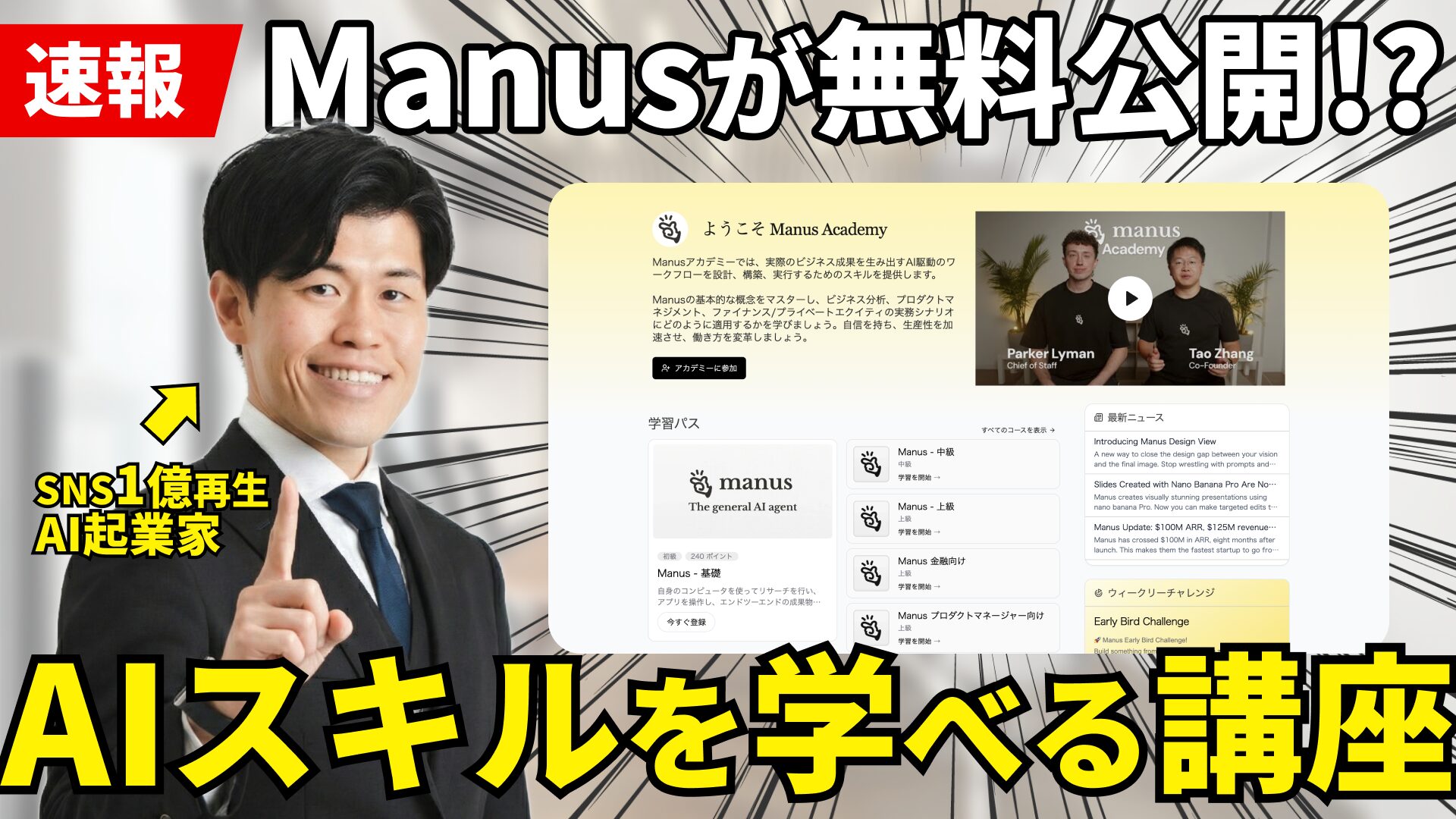 「AIの時代」と言われて久しいですが、「何から学べばいいかわからない」「プログラミングは難しそう」と、一歩を踏み出せずにいませんか?そんなあなたに朗報です。今、世界で最も注目されているAIエージェント「Manus」が、なんと完全無料でAIの活用スキルを学べるオンライン学習プラットフォーム「Manus Academy」を公開しました。もうAIは、一部の専門家だけのものではありません。ビジネスの現場で、あなたの強力な武器になります。このマニュアルを手に、AIスキル習得への第一歩を踏み出しましょう!