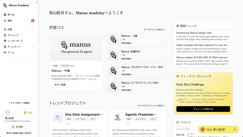 • チャレンジ: 期間限定で様々なチャレンジが開催されます。例えば「アーリーバードチャレンジ」では、基礎コースを修了してプロジェクトを作成・共有するだけで、最大8,000クレジット(Manusを利用する際に使えるポイント)を獲得できるチャンスがあります。 アーリーバードチャレンジ