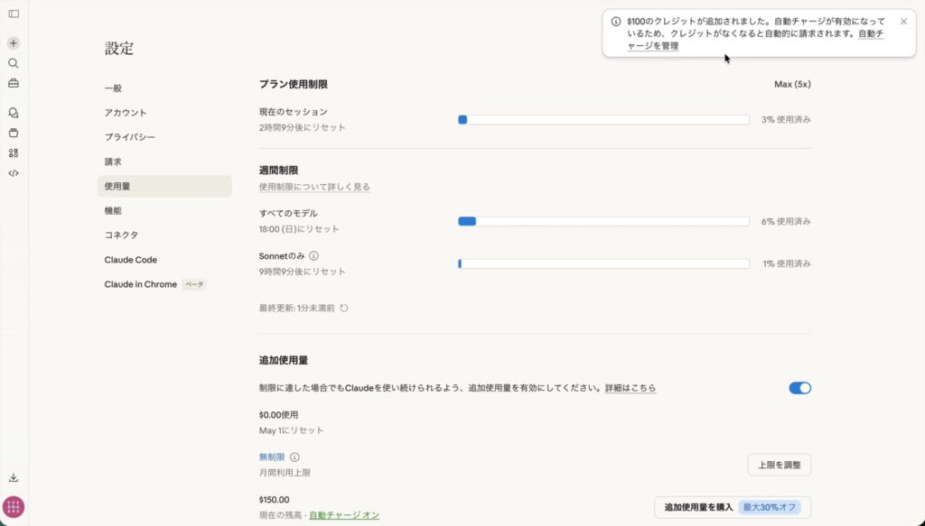 追加使用量の欄では、従量課金の状況を確認できます。Anthropic社から付与された$200のクレジットがここに反映されます。「追加使用量を有効にしてください」のトグルをONにすることで、サブスクリプションの利用枠を超えた場合でもClaudeを使い続けることができます。