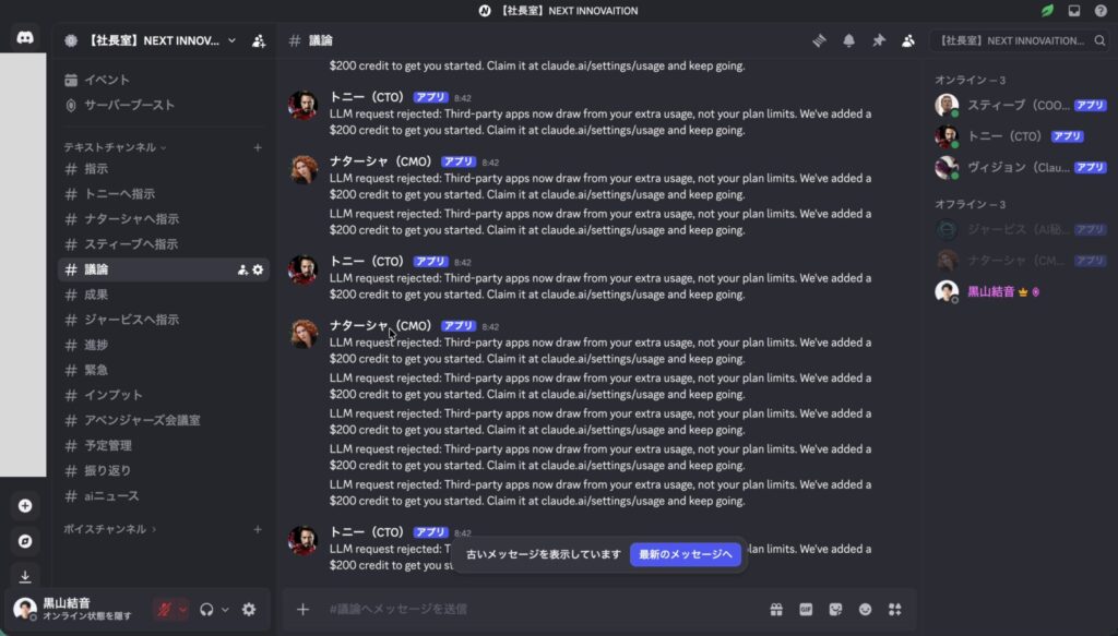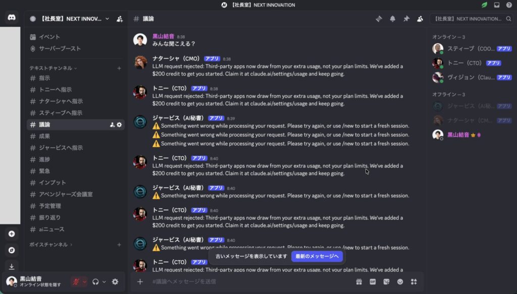 筆者の環境では、AIエージェント同士がメンションなしで会話できる設定にしていたため、エラーメッセージに対してAIが反応し、そのエラーにまたAIが反応するという無限ループに陥ってしまいました。